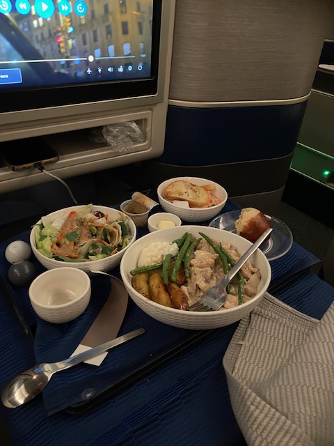 The food was excellent, with ample portions. We were offered two meals, including dinner right after takeoff and breakfast before landing. The service was excellent, but my flight attendant was better than the one assigned to my wife, who didn’t check in on her quite as often.